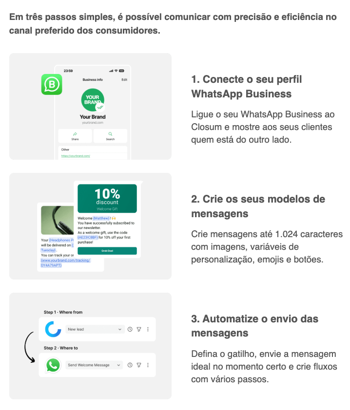 Quem nunca desejou ter uma comunicação mais eficaz com os seus clientes, sem complicações, sem a frustração dos e-mails ignorados ou das mensagens de texto que nunca são abertas? Não seria maravilhoso se a sua marca pudesse comunicar com os clientes através de um canal que eles já adoram, um espaço onde a proximidade e a resposta imediata estão garantidas? A boa notícia é que esse momento chegou! Apresentamos o Closum WhatsApp.