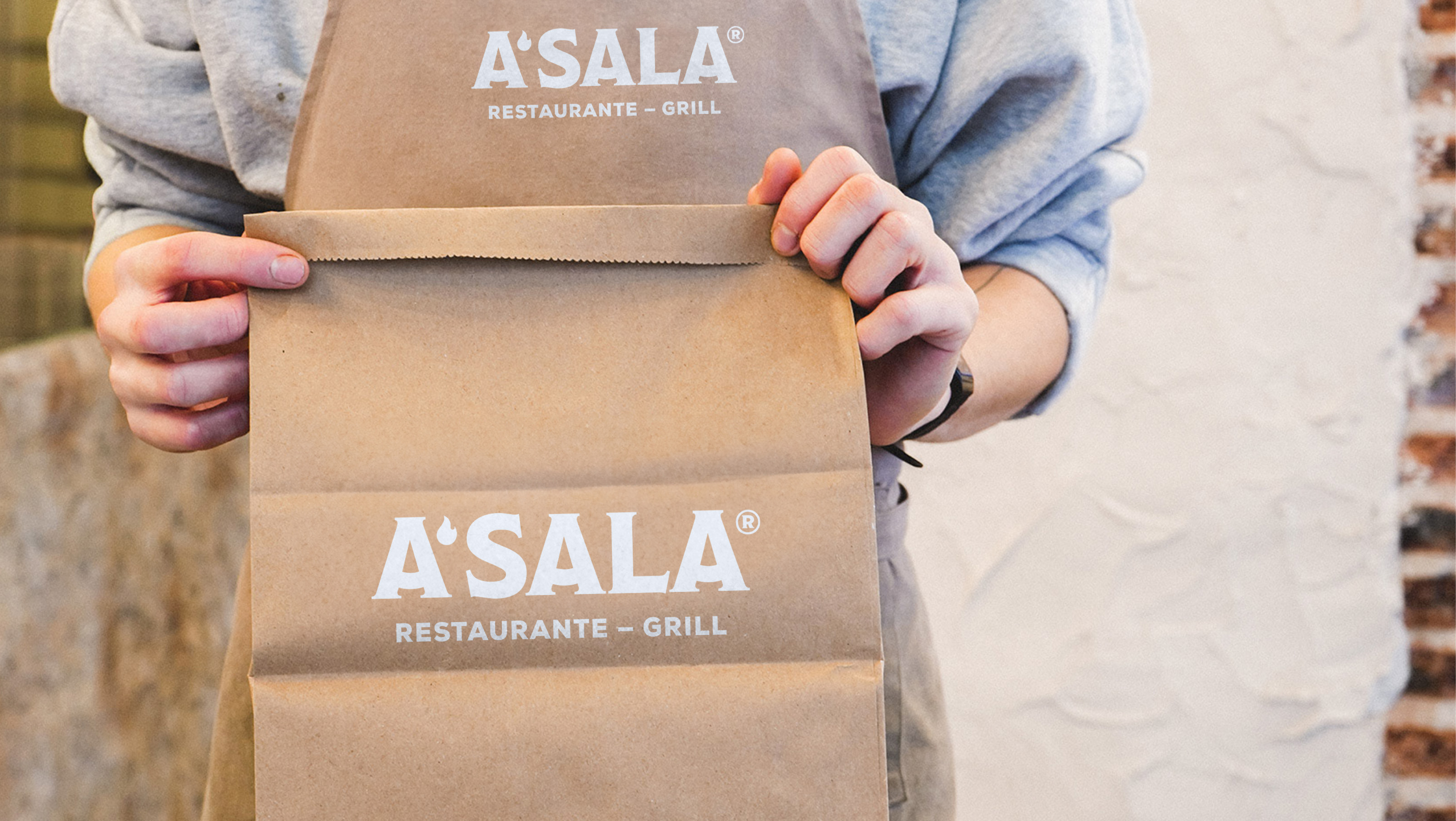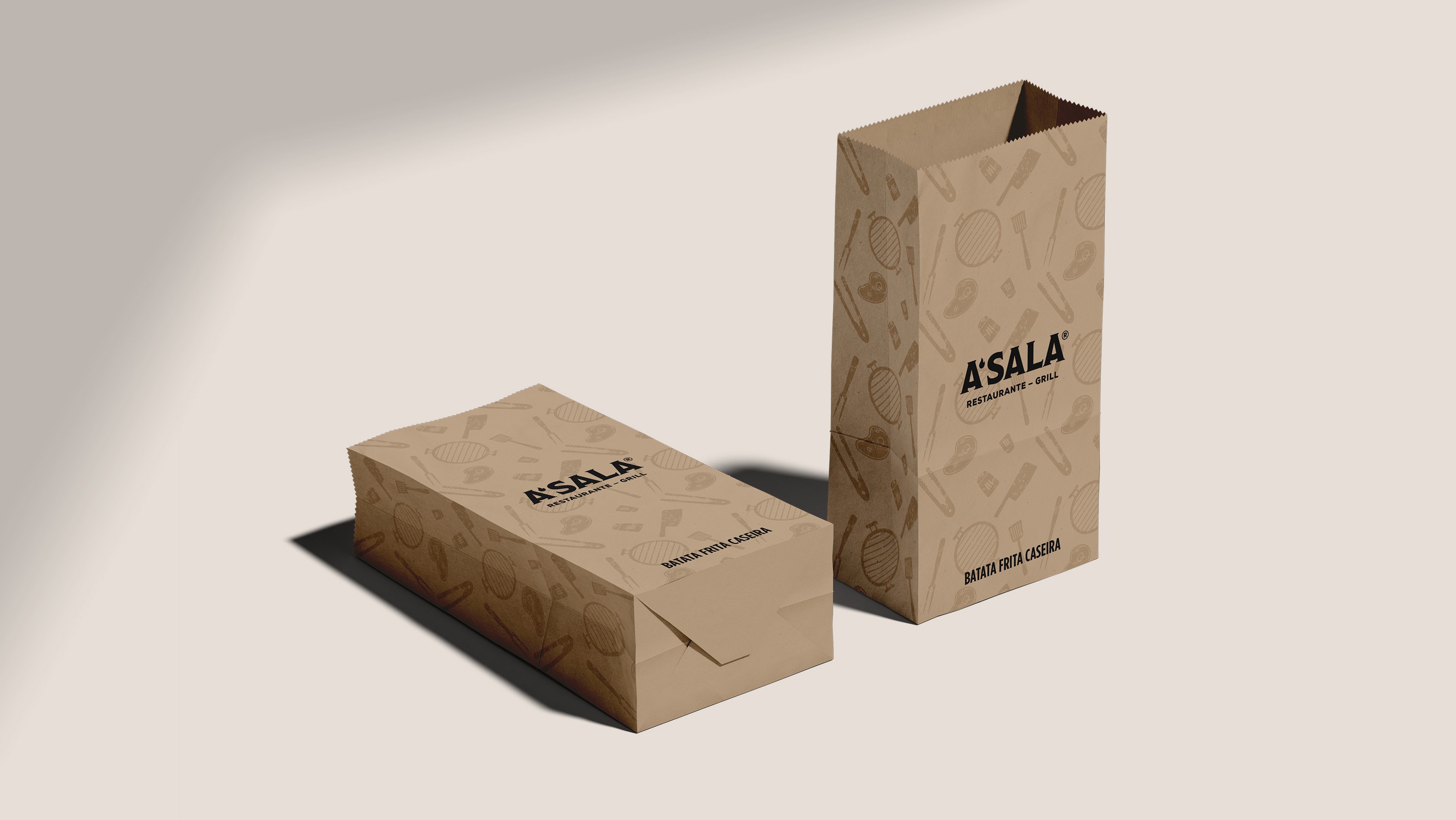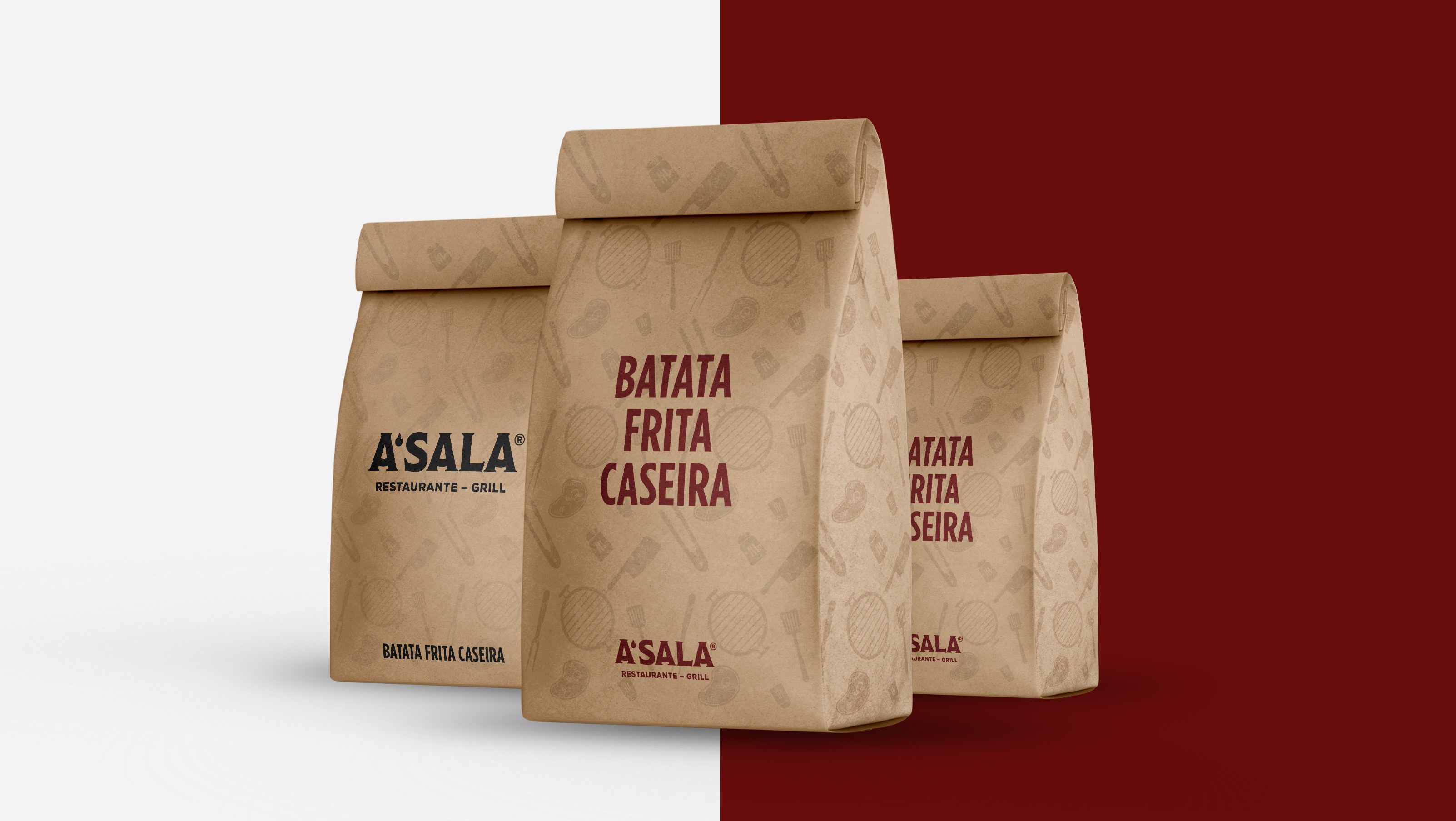 Tudo o que vai para casa do cliente é A’Sala, desde a saca para a batata frita caseira, como as embalagens da carne grelhada devidamente identificadas. Levar a comida para casa não é só uma oportunidade de aumentar o volume de vendas; é também ser tema de conversa em família.