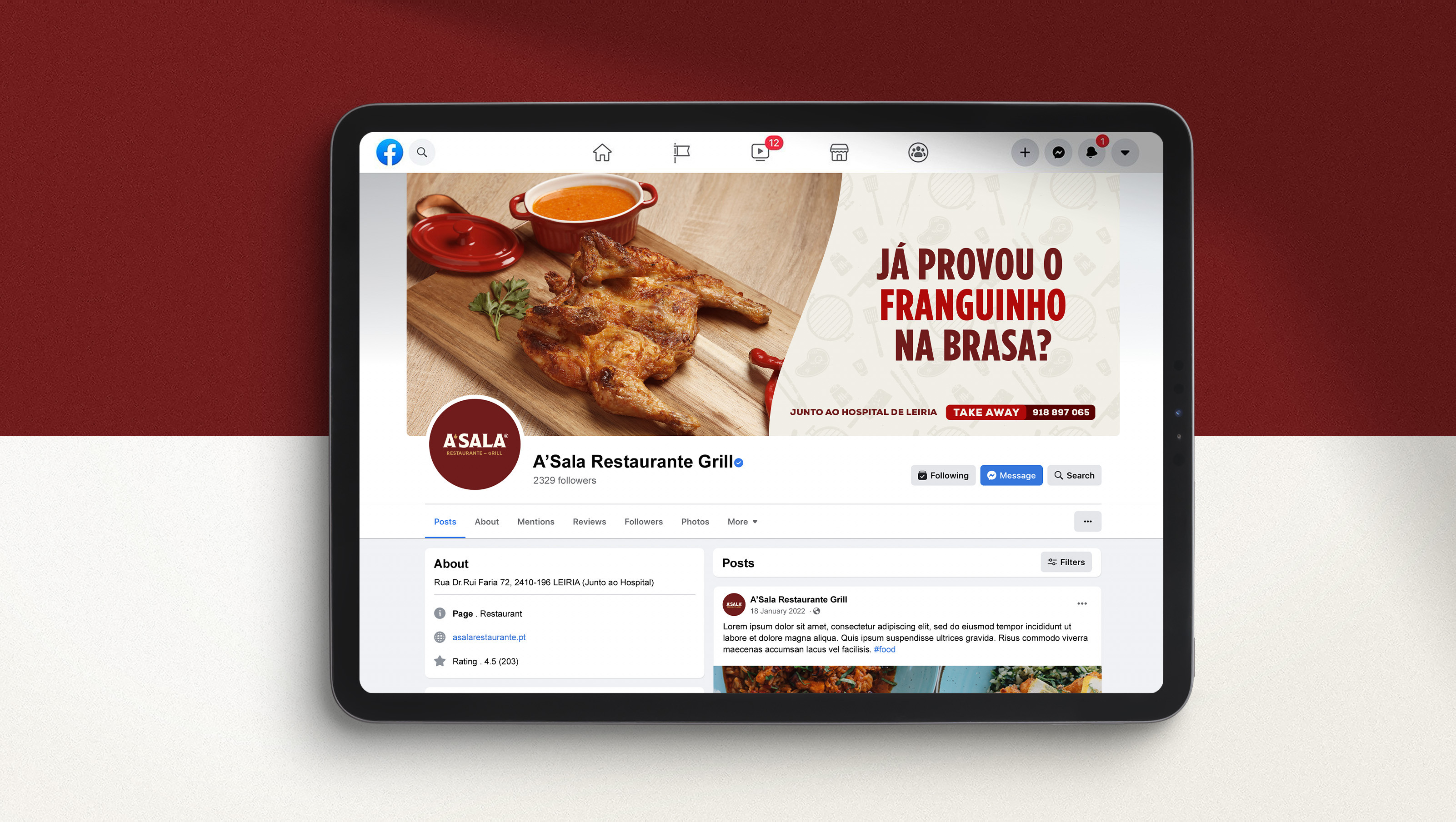 O restaurante A’Sala tem um produto de sucesso e uma localização privilegiada - na entrada de Leiria. O seu foco são as carnes grelhadas de alta qualidade e o seu objetivo é entregar uma refeição completa, saudável, num ambiente calmo. Tudo o resto, incluindo identidade visual, é caso para delegar funções com a Drible, #claro!