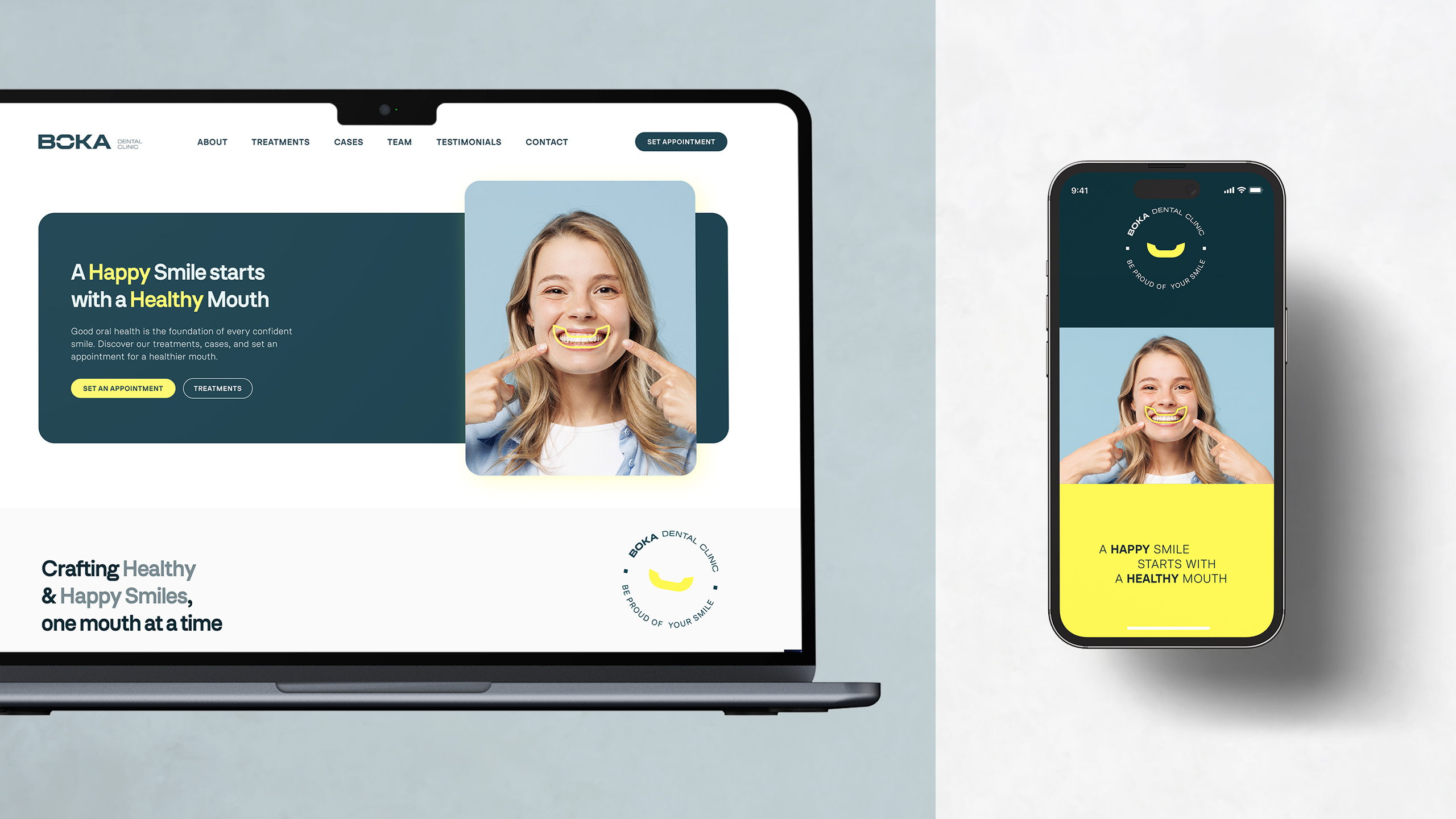 Toda a identidade foi pensada para viver bem nos diversos formatos: cartões de visita, website, redes sociais, placas, merchandising. O ícone do sorriso torna-se um selo de confiança, um símbolo de cuidado, e uma marca que se cola à memória, como um bom aparelho invisível, está sempre lá, mesmo quando discreto.