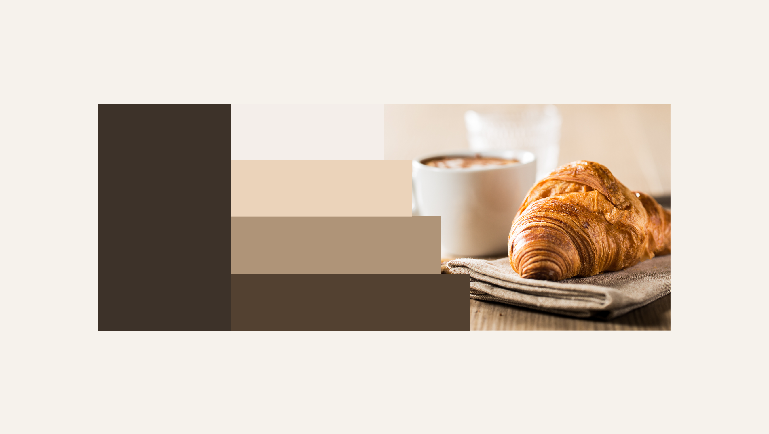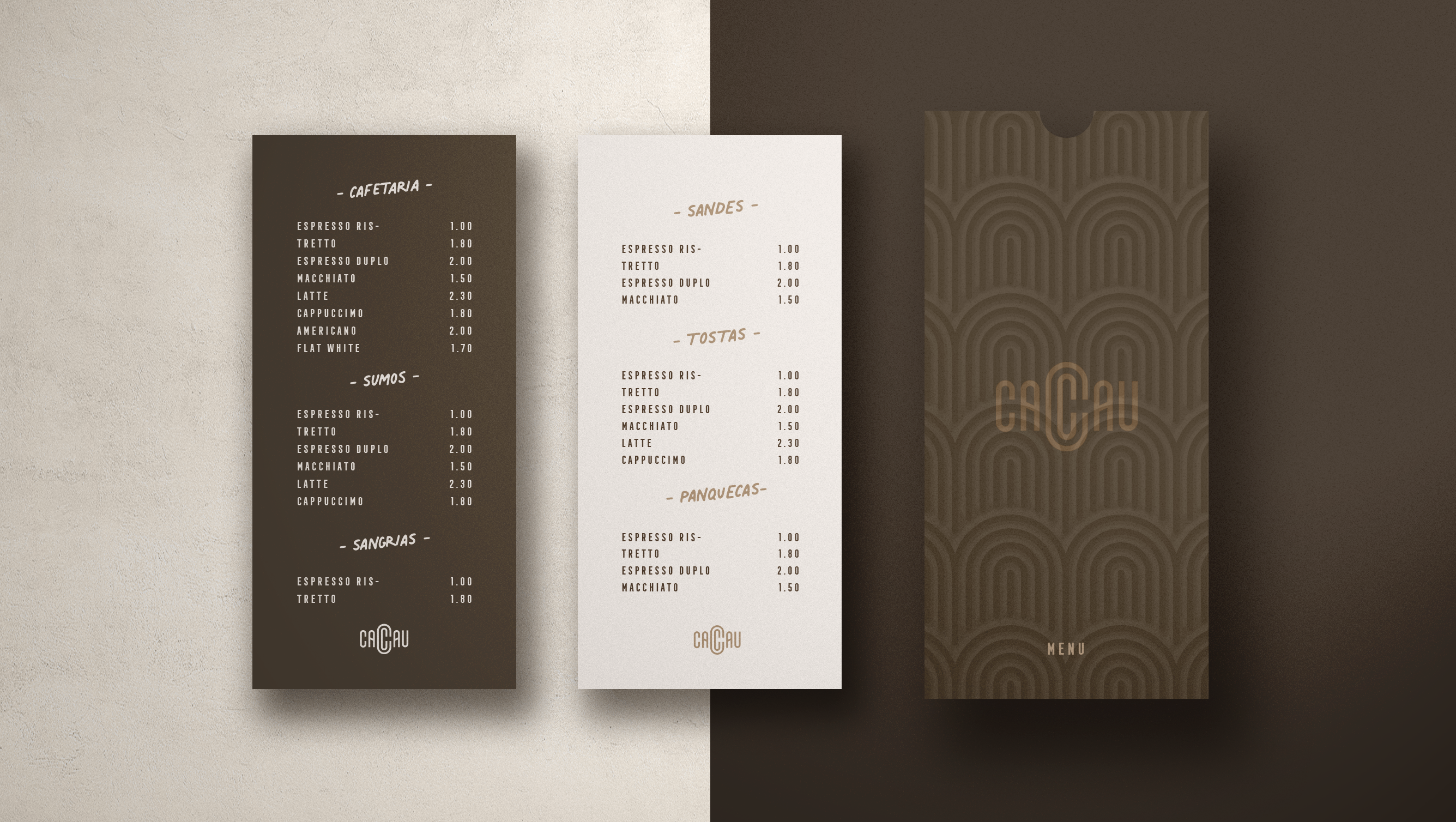 Para desenvolver o logótipo utilizamos a letra C em duplicado, tal como escrito no próprio nome, uma duplicação de formas que cria dinamismo, diferenciação e que nos permite obter um padrão exclusivo que utilizamos em alguns suportes da marca. Pensando em capuccino, em croissant, em mel e panquecas, sem esquecer o chocolate, incluímos na nossa paleta de cores os castanhos e os cremes, com uma variação de contraste diferenciado.