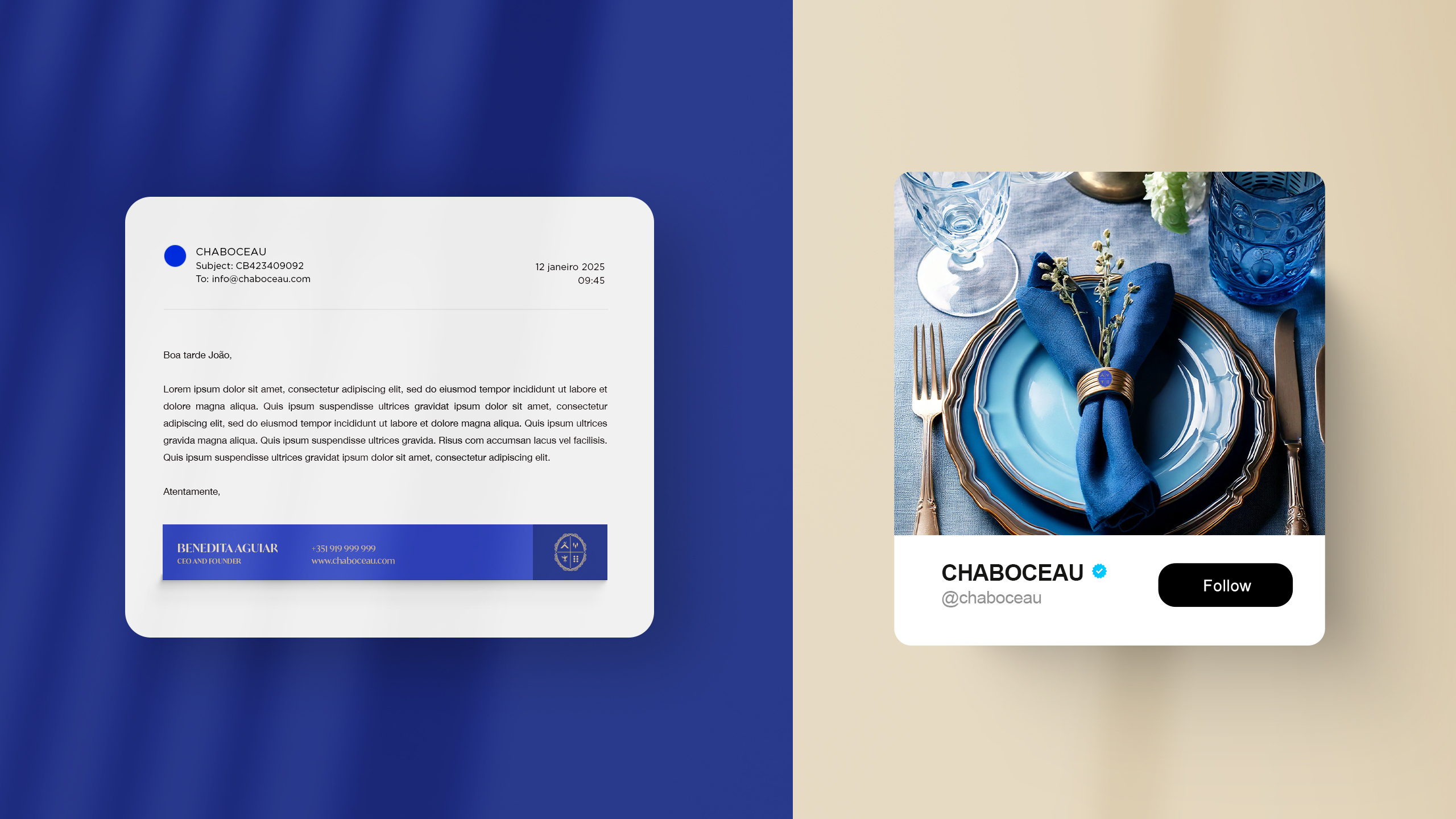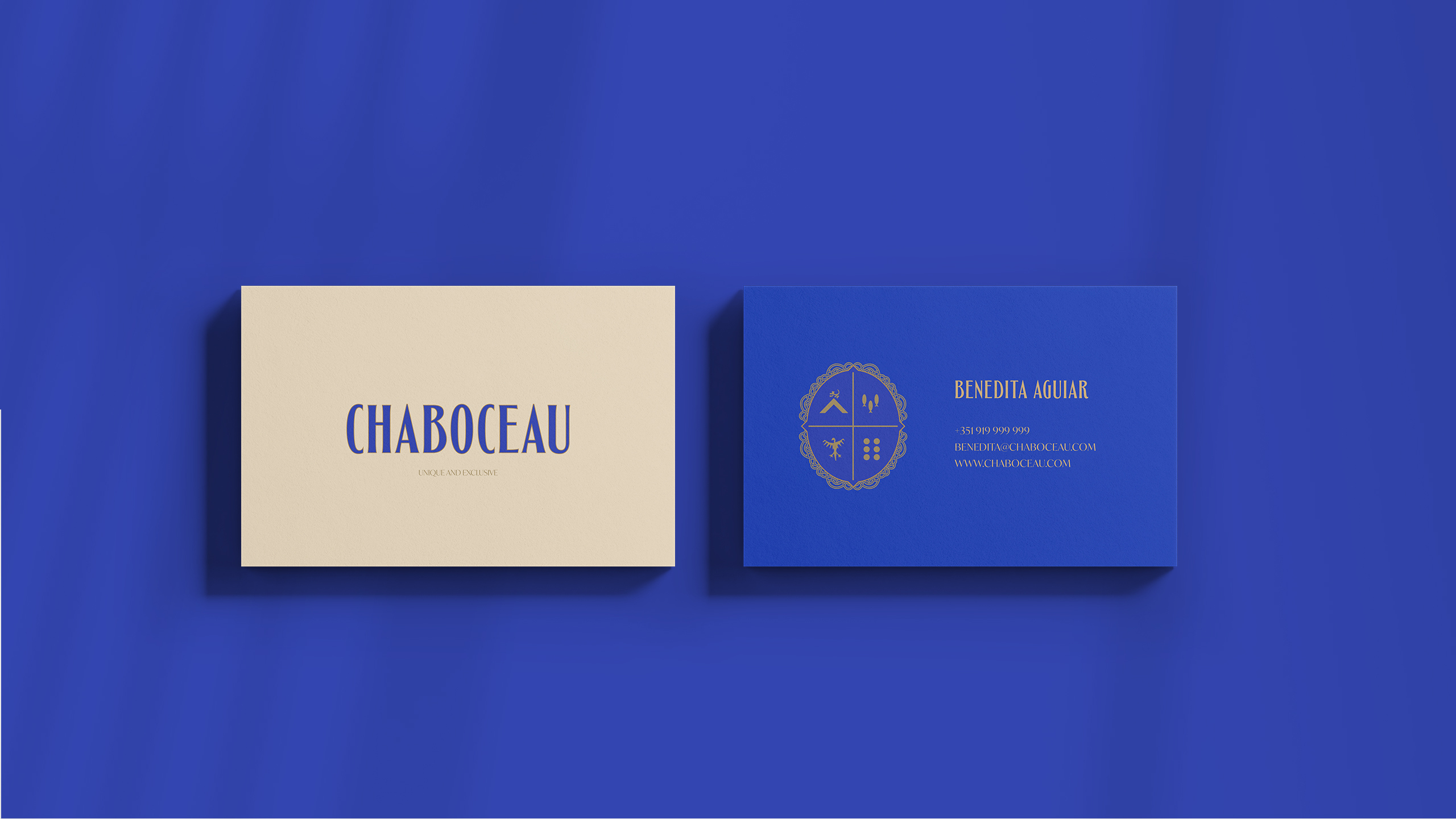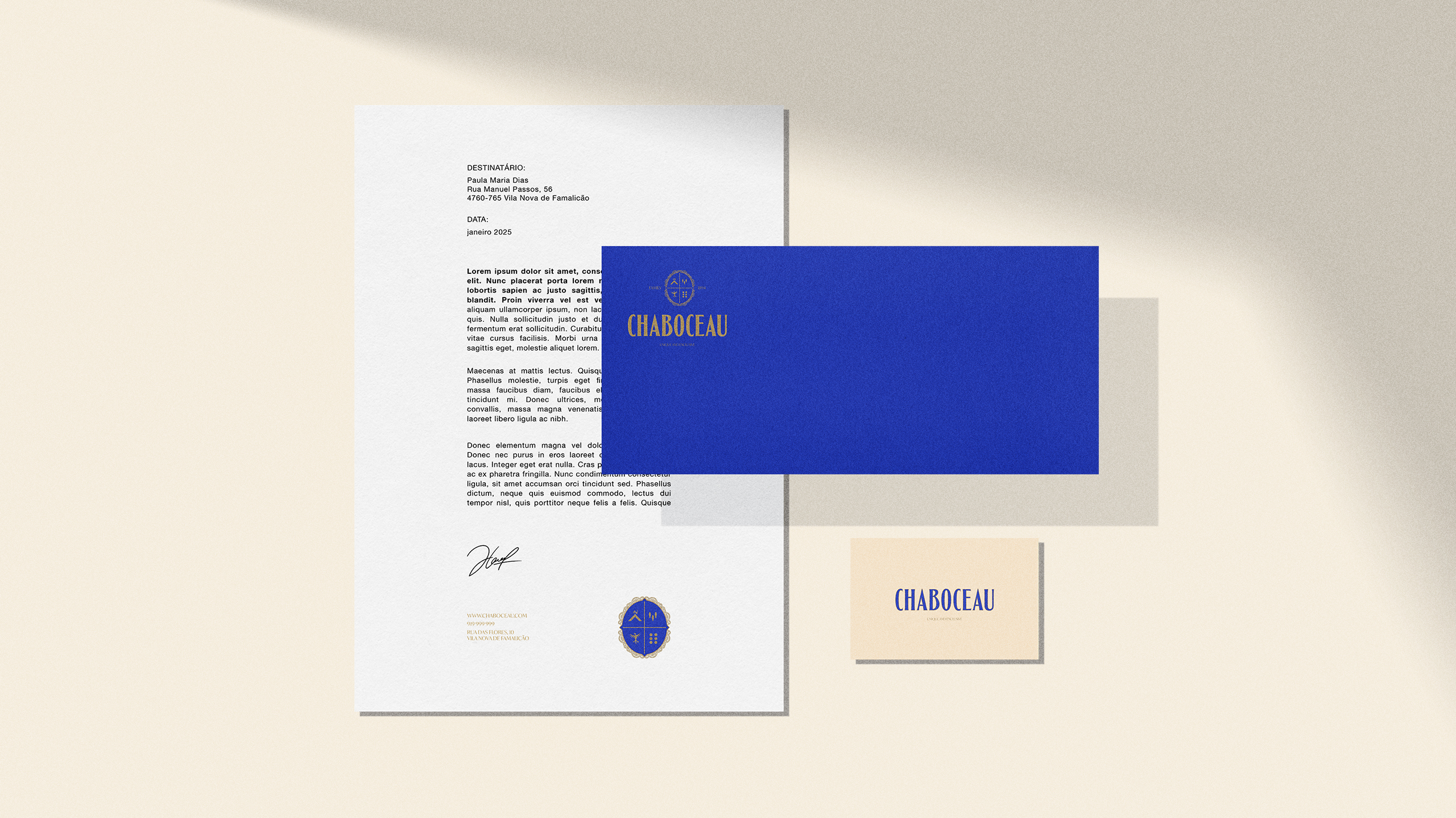 Cada detalhe é uma extensão do universo Chaboceau, desde o tipo de letra, à textura dos materiais dos envelopes e cartões de visita, à escolha dos símbolos que contam histórias que se refletem para as redes sociais.