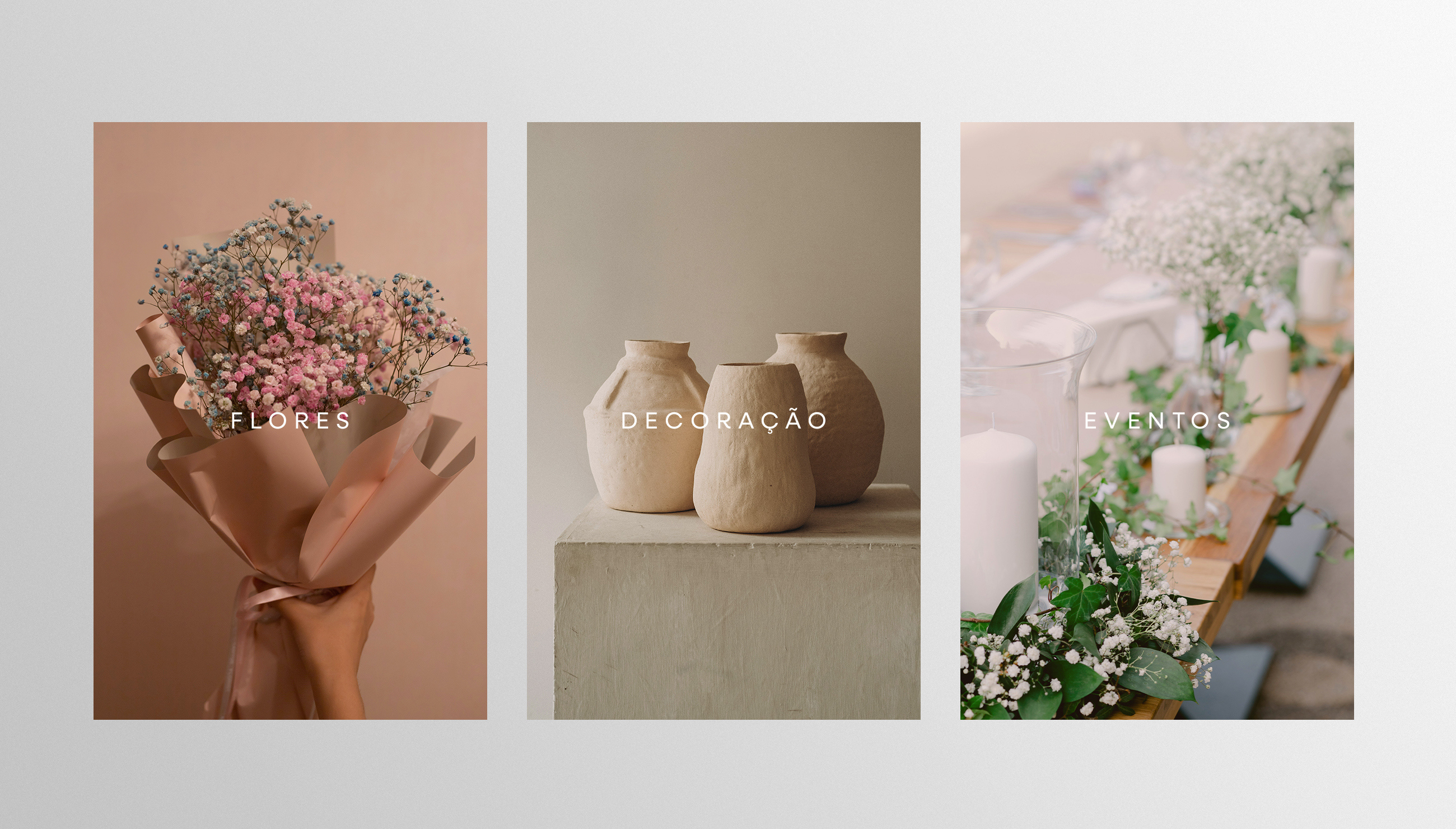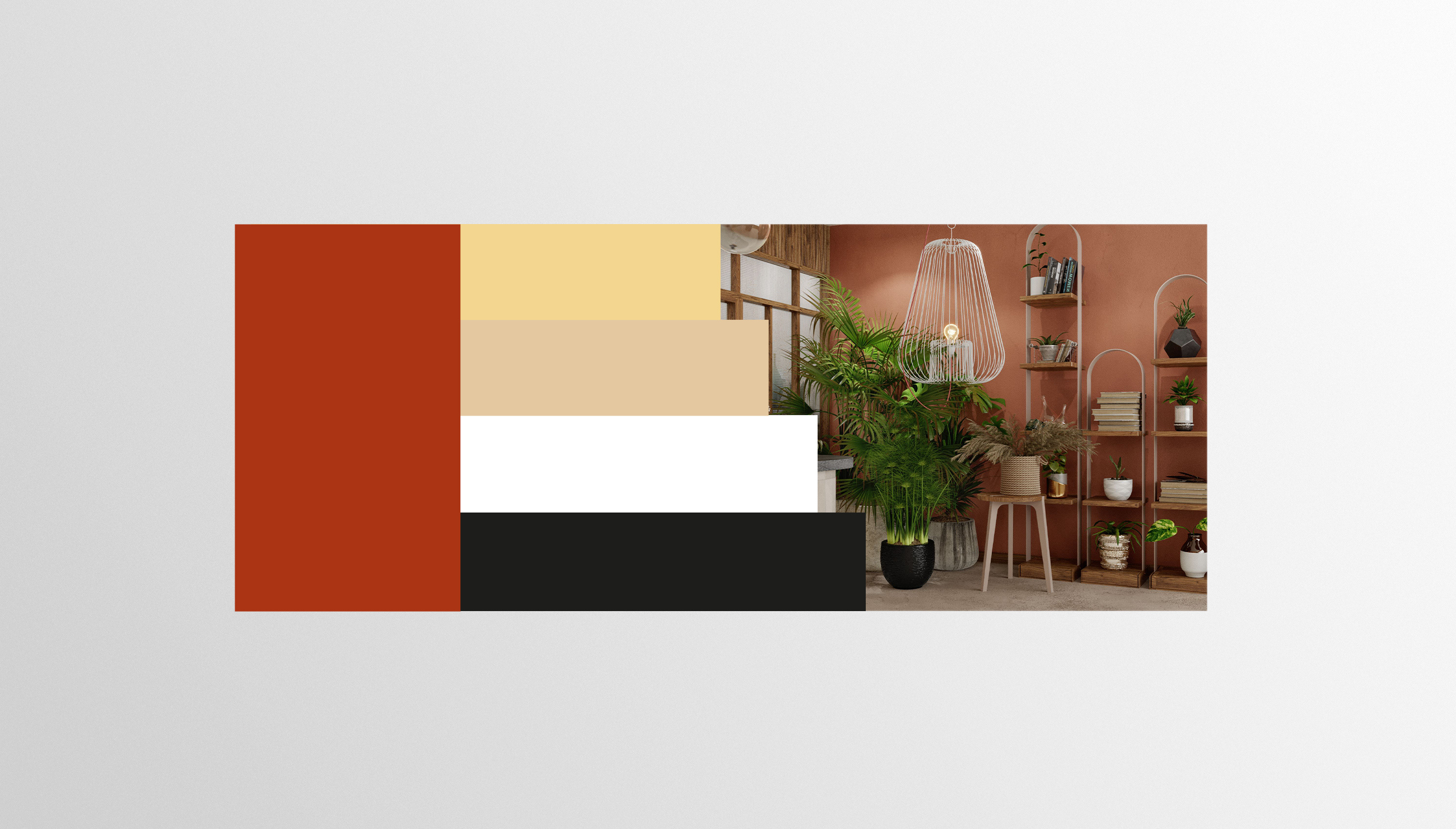 Para as cores, optámos por um terracota profundo e um areia suave. O terracota evoca calor, confiança e modernidade, enquanto o areia traz luminosidade e frescura, remetendo à vitalidade das flores e à natureza.