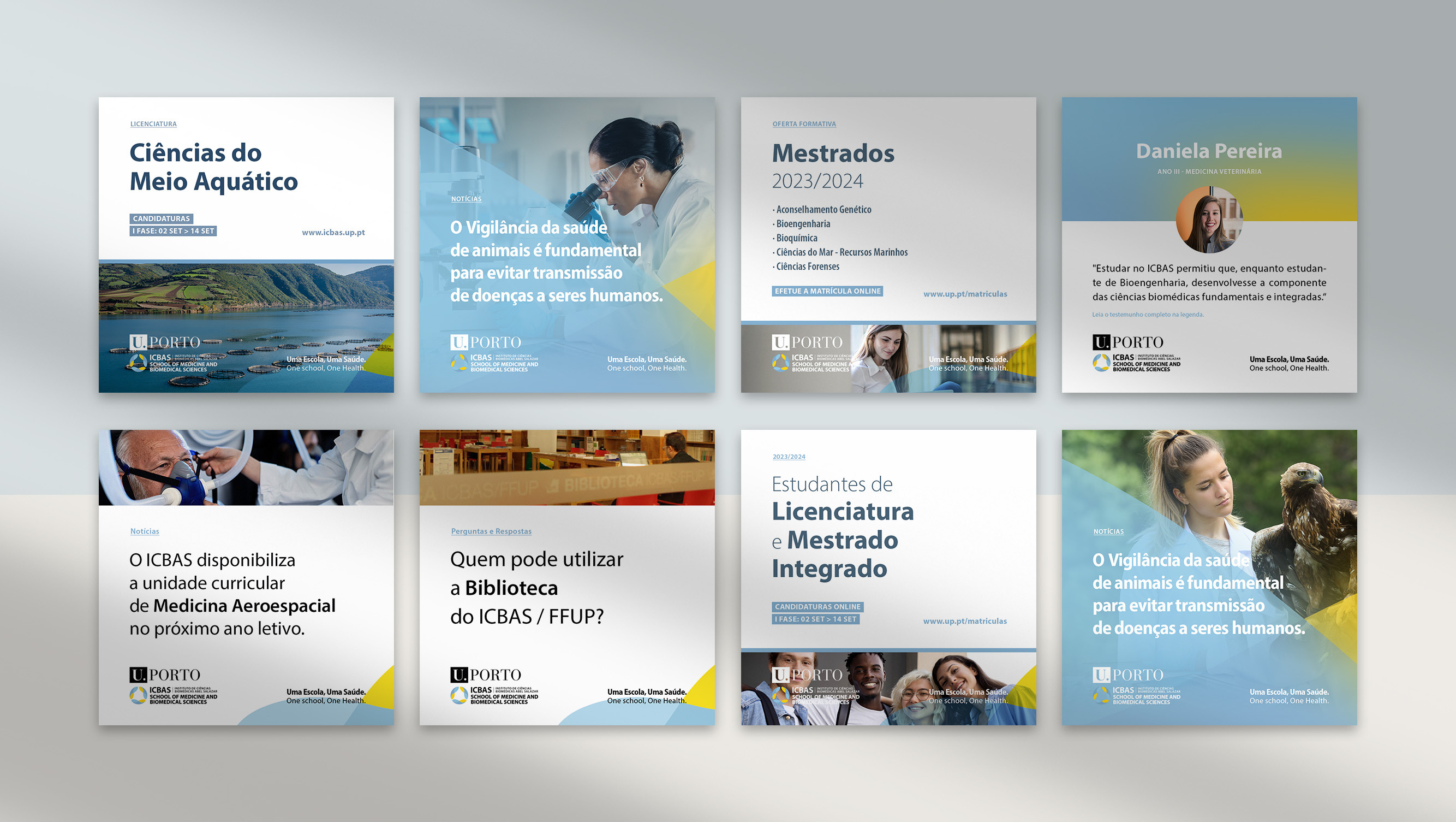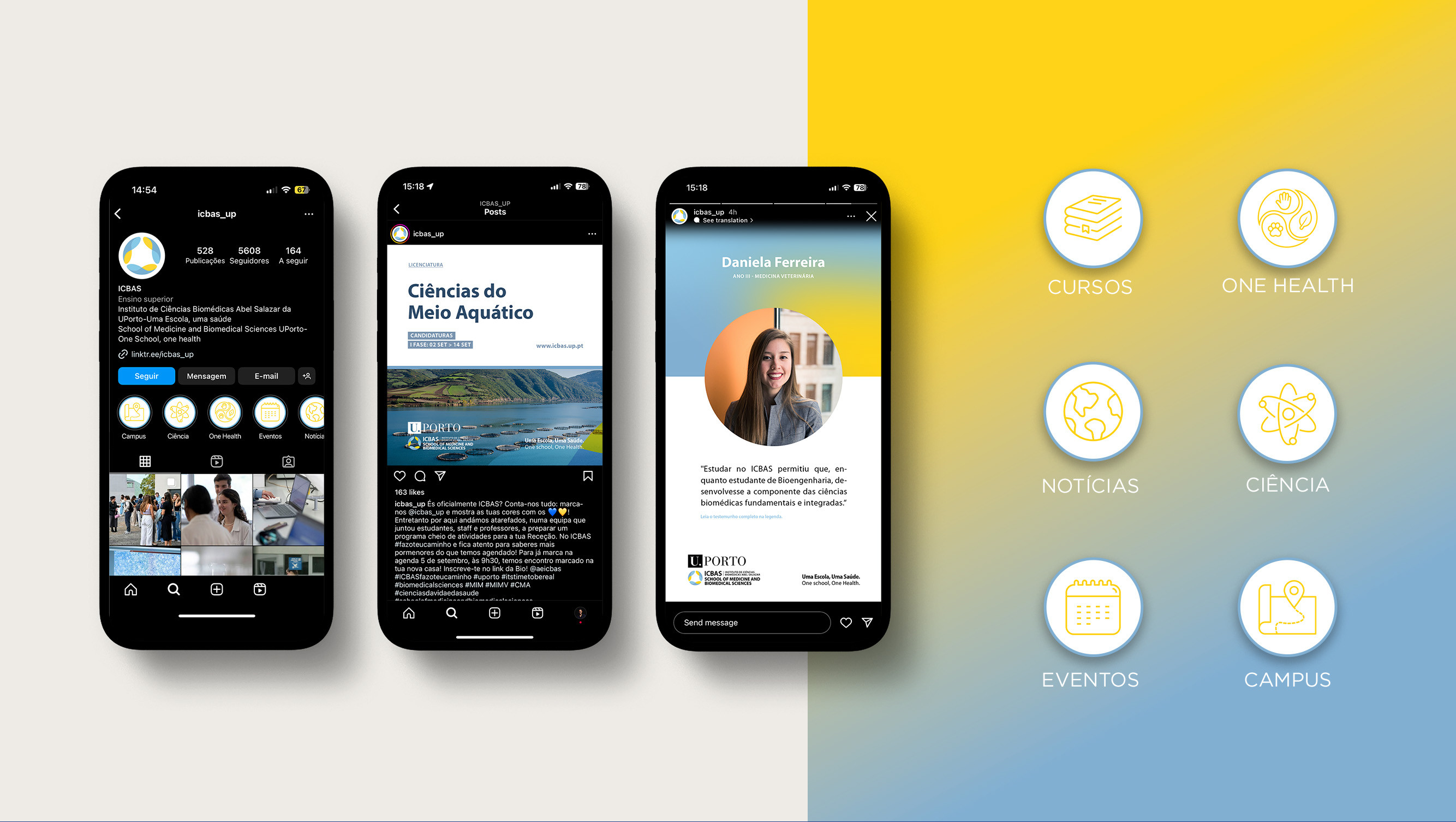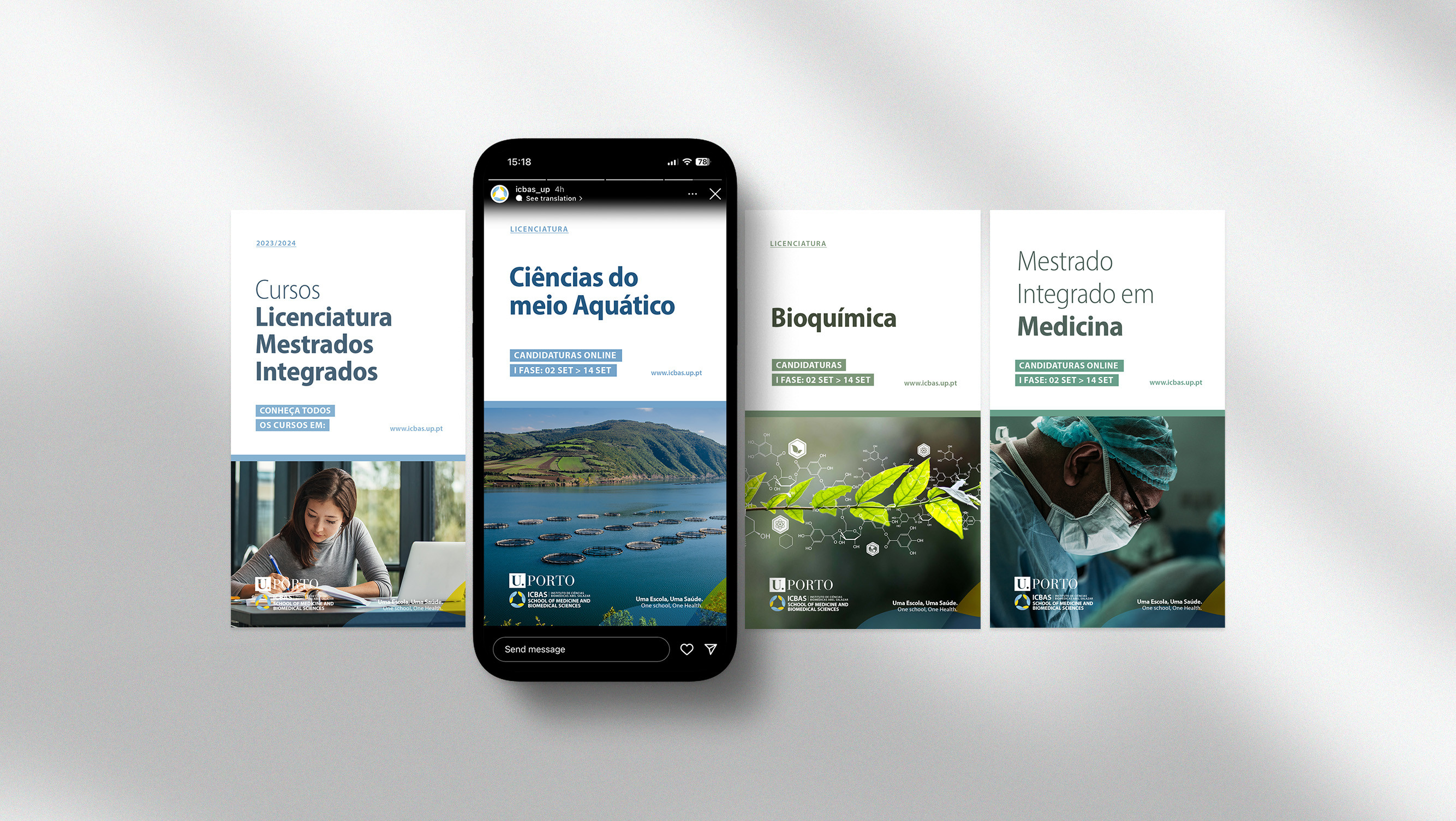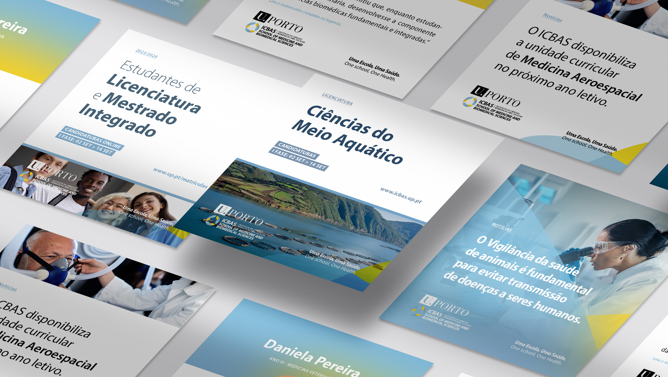 Redes sociais: criamos conteúdos dinâmicos e atuais para partilhar lançamentos de cursos, testemunhos de alunos e investigadores, eventos e notícias. Cada post foi desenhado para refletir a essência do ICBAS.