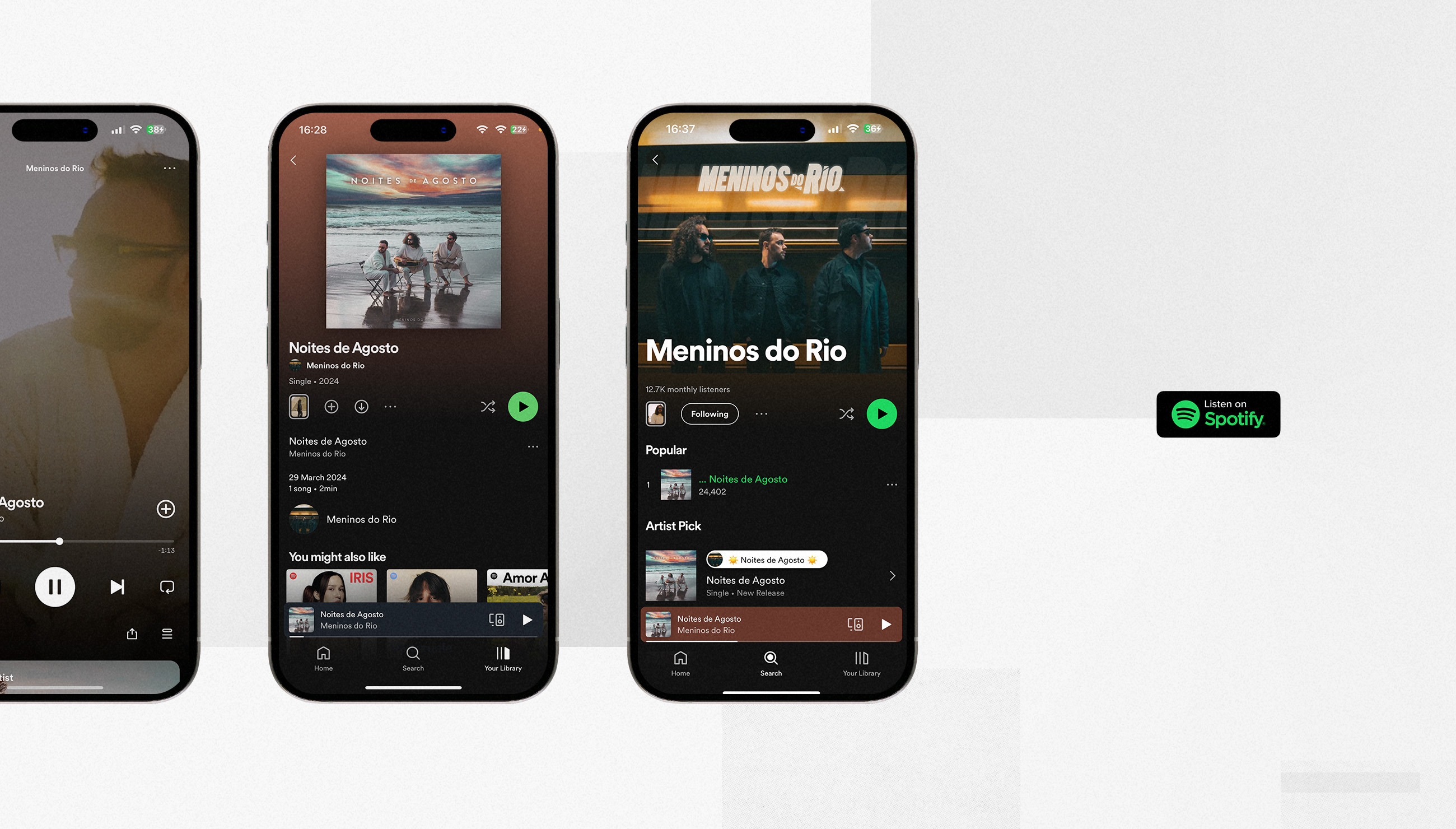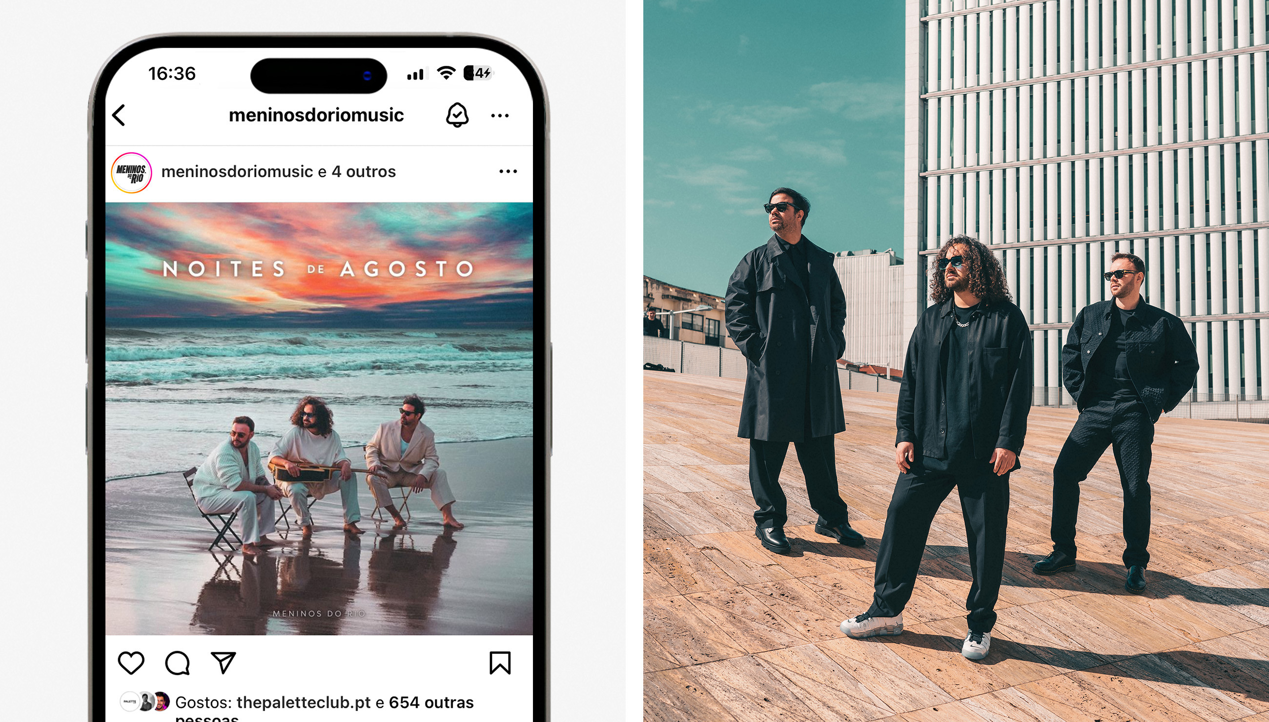 É o início de uma história de amor que começa naquela noite de agosto. Noites de agosto, o primeiro single dos Meninos do Rio, foi lançado em março de 2024 e teve mais de 171 mil visualizações. A capa, essa capa onde se sente o vento, foi criada pela Drible.