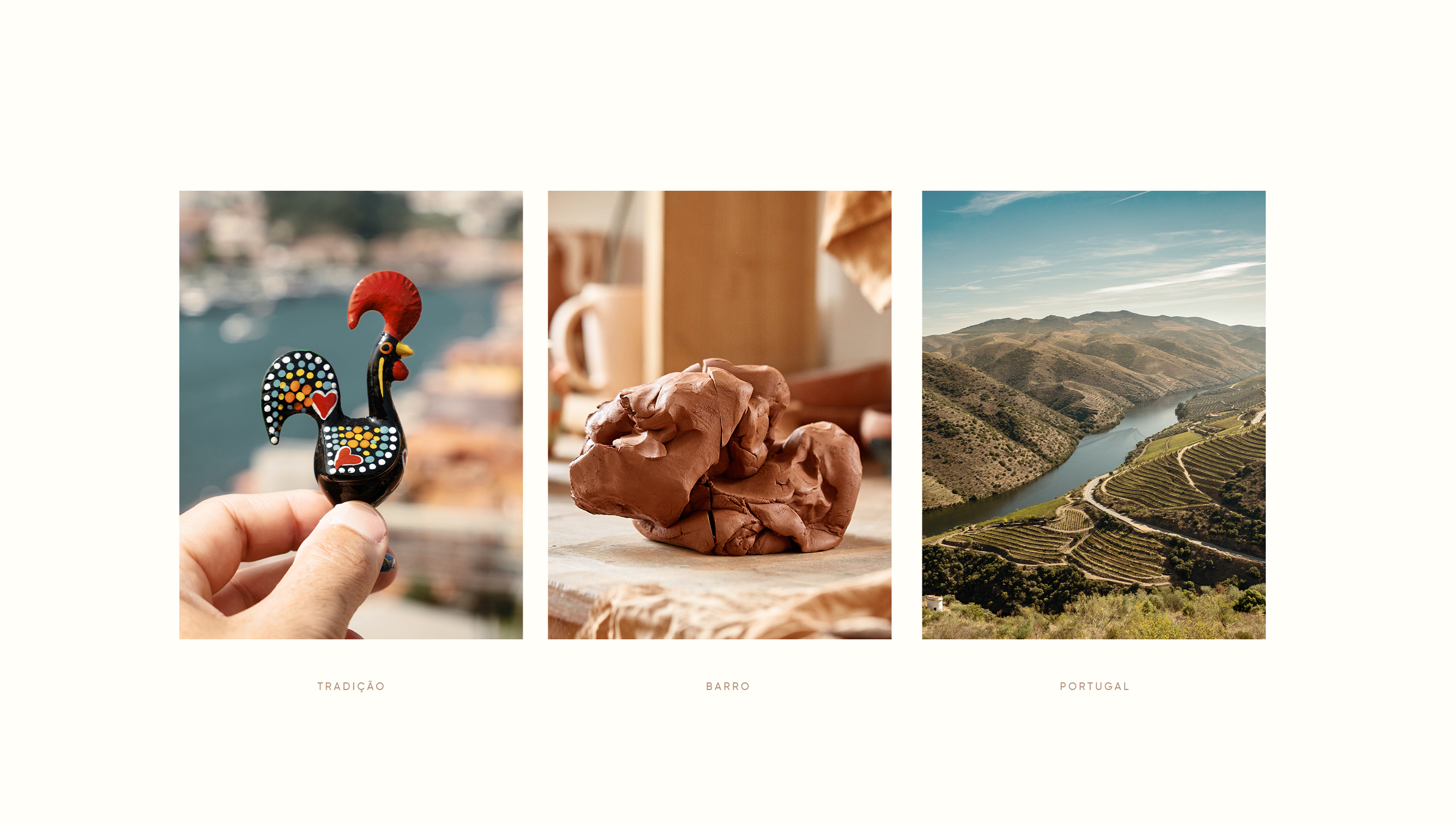 A paleta de cores, em tons de castanho e camel, transmite a riqueza e a tradição do barro, enquanto o contraste com o preto e branco adiciona sofisticação e destaque aos detalhes. Essas cores simbolizam a elegância das peças em cerâmica que a marca oferece.