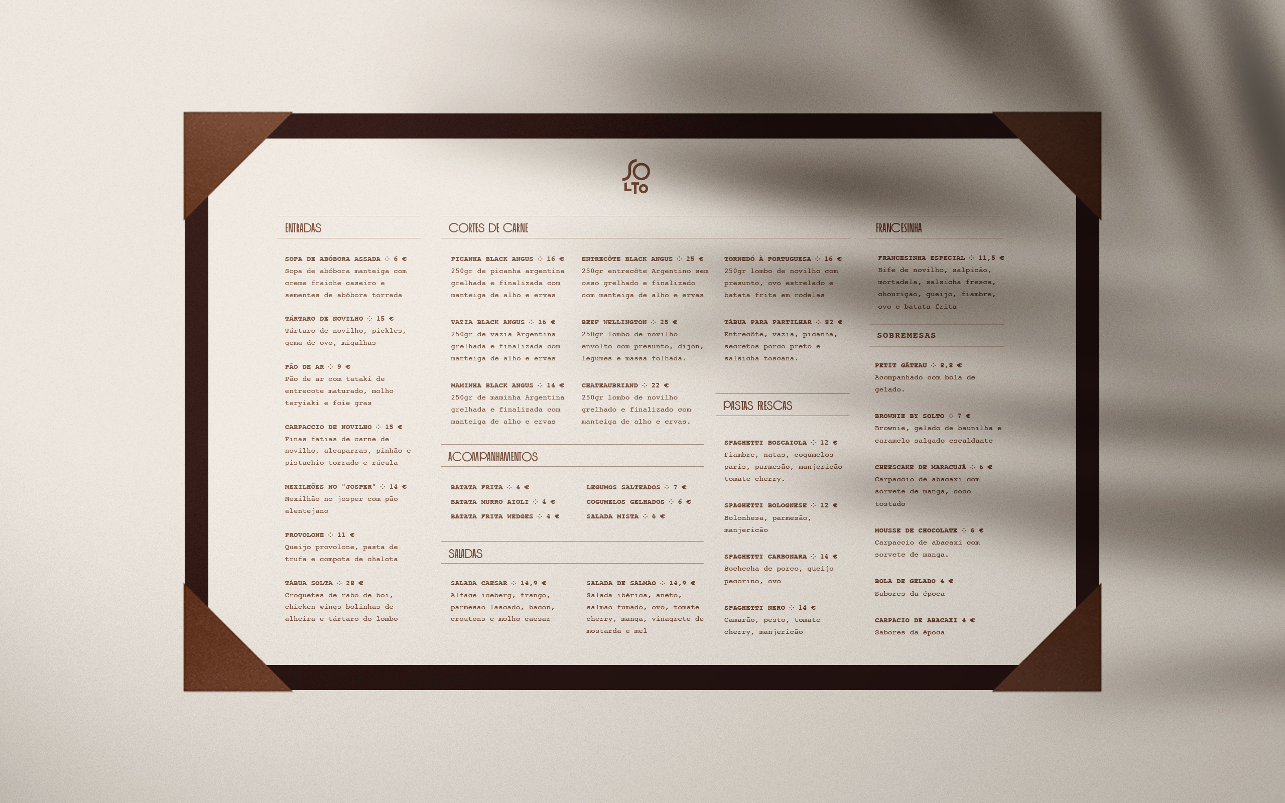 Criámos desde o logótipo até ao menu, desenhámos cartões de visita, aventais entre outros materiais gráficos que “soltam” a identidade da marca em cada suporte. Cada elemento foi desenvolvido para reforçar a presença do Solto no mercado. Uma linguagem visual coesa que transmite a essência do restaurante em cada ponto de contacto.