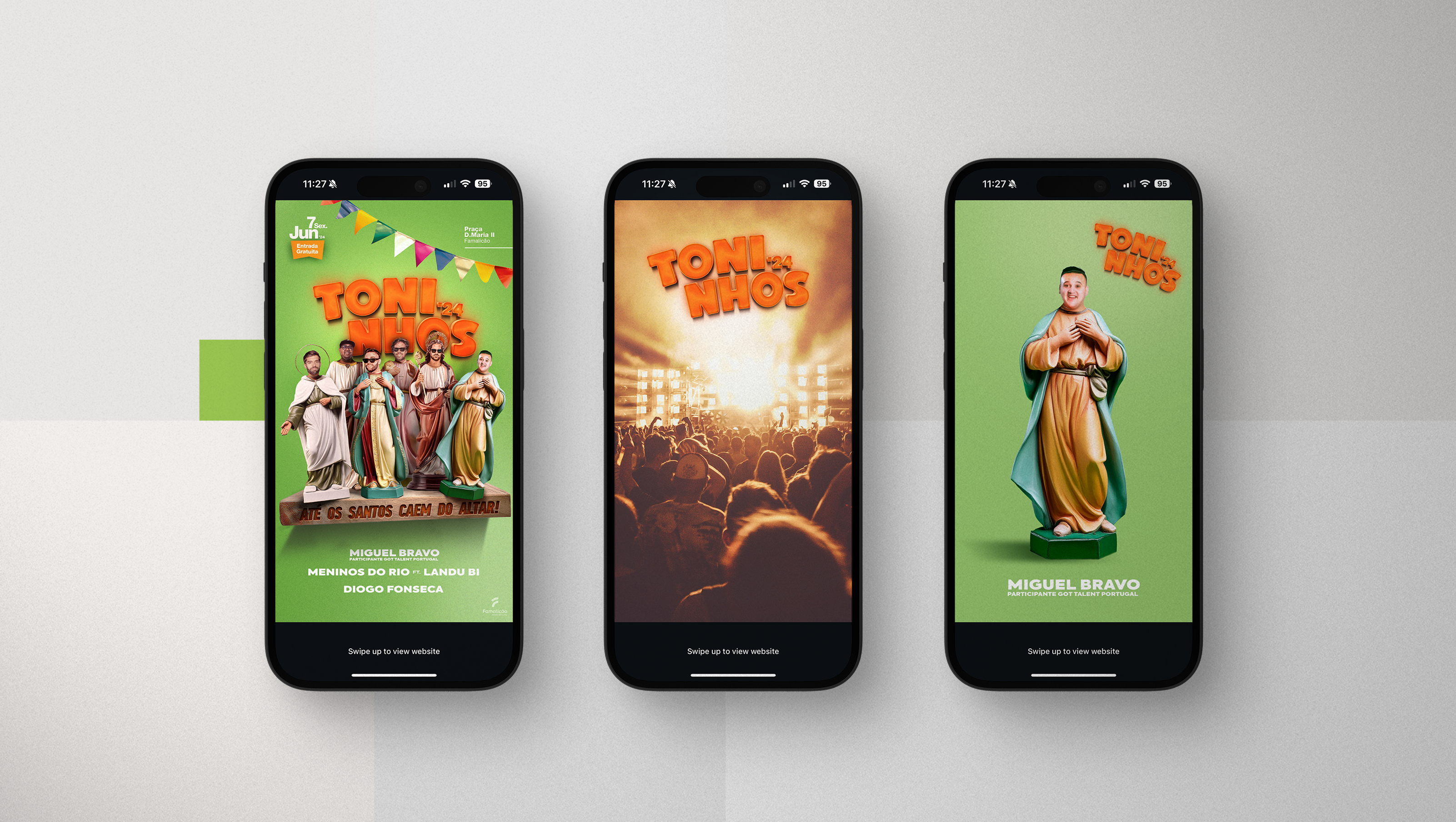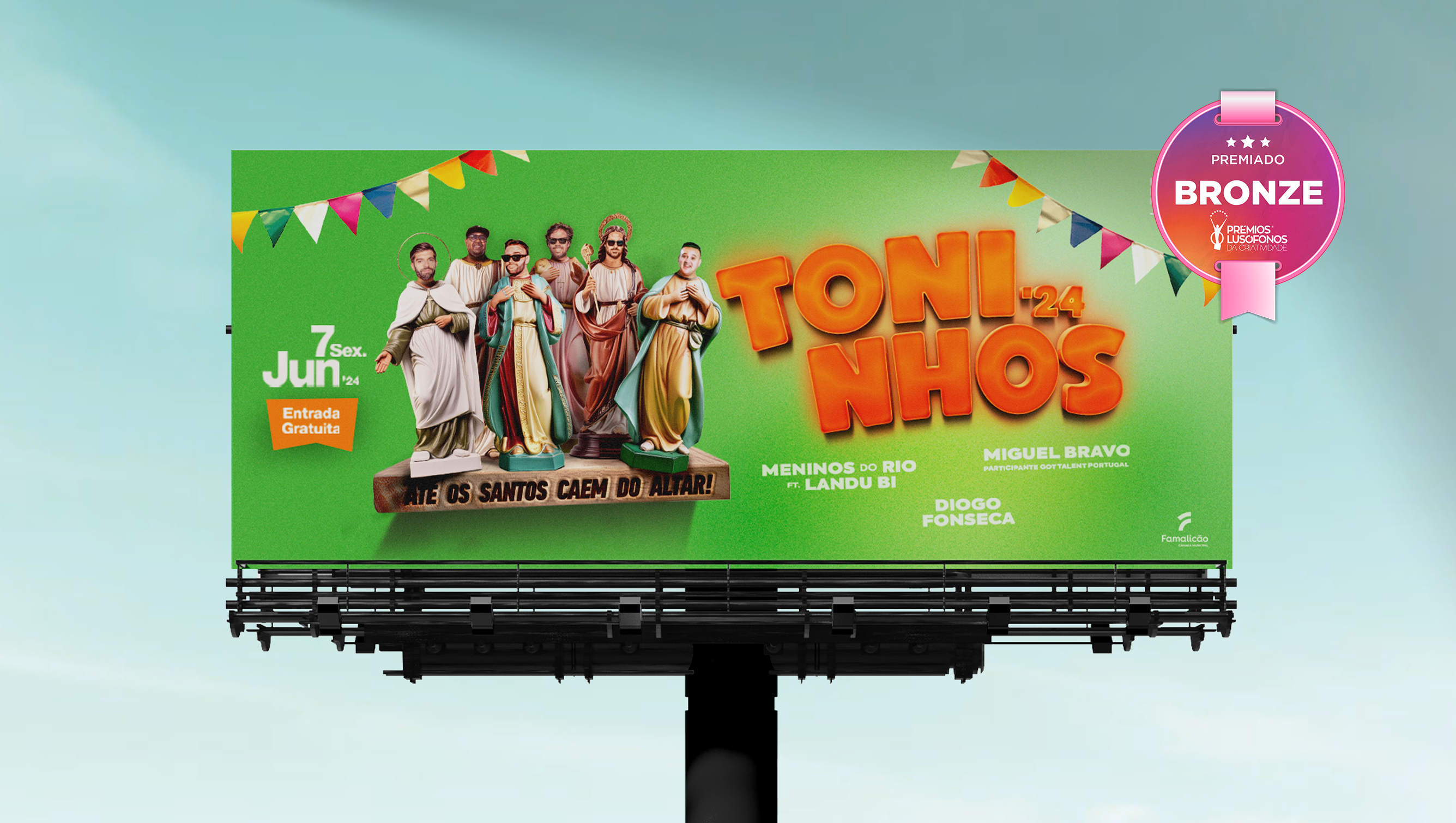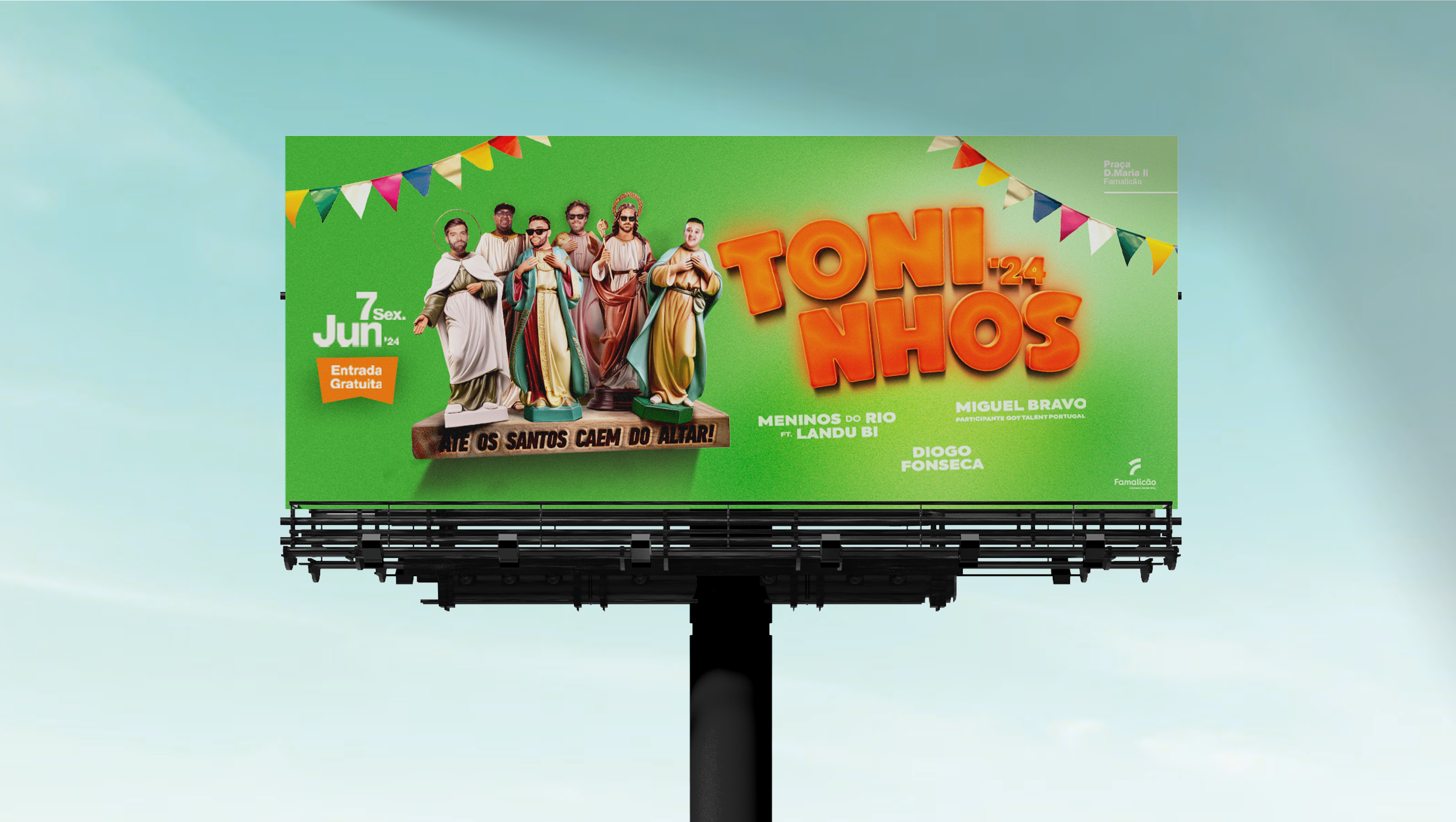 De modo a representar uma vertente divertida, lançamos uma proposta que englobasse a figura dos santos populares em porcelana e os artistas presentes no evento. A ideia era fazer uma montagem em que chamamos aos artistas de santos, colocando as caras deles na figura dos santos populares de forma criativa e original. Este arraial alia os concertos de artistas nacionais ao ar livre com diversão, cultura e muita animação ao populismo das festas da cidade.