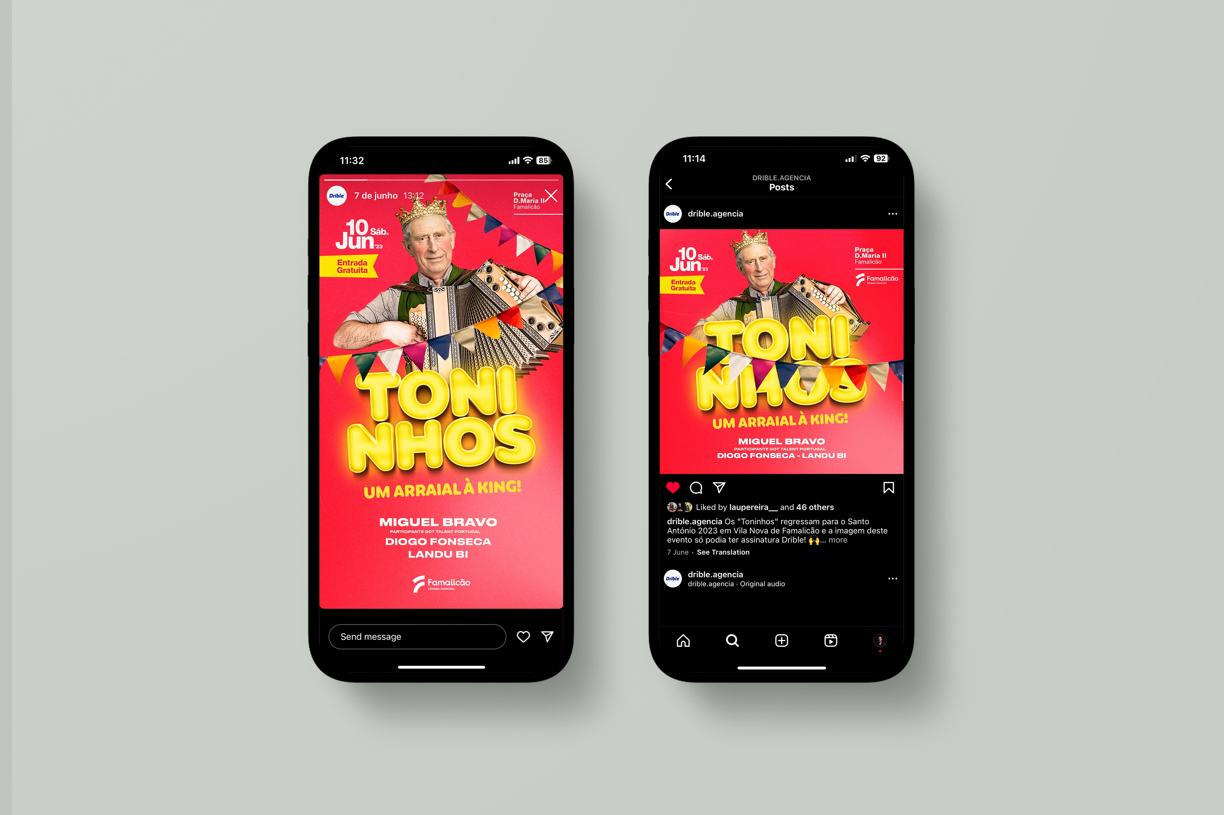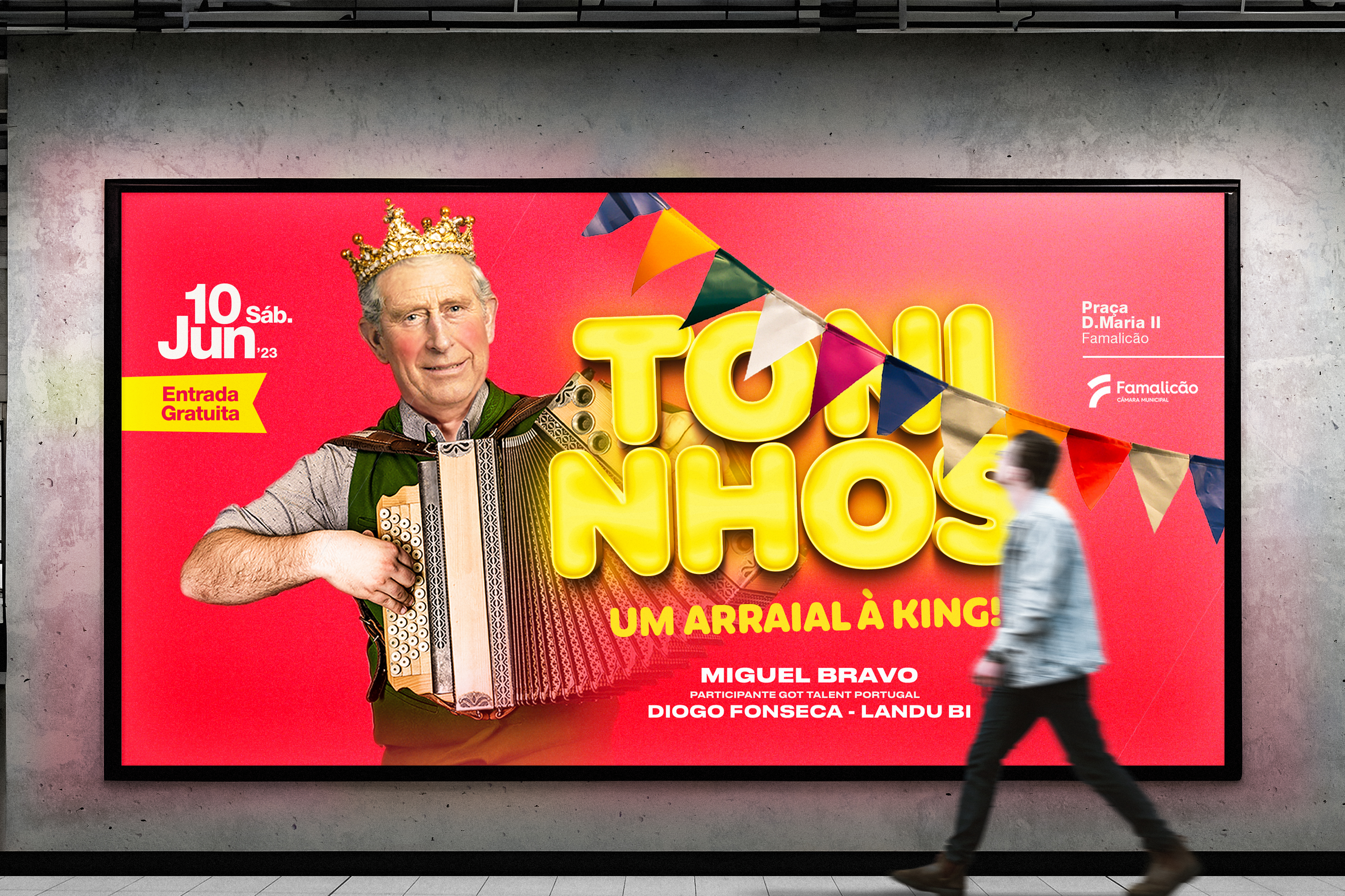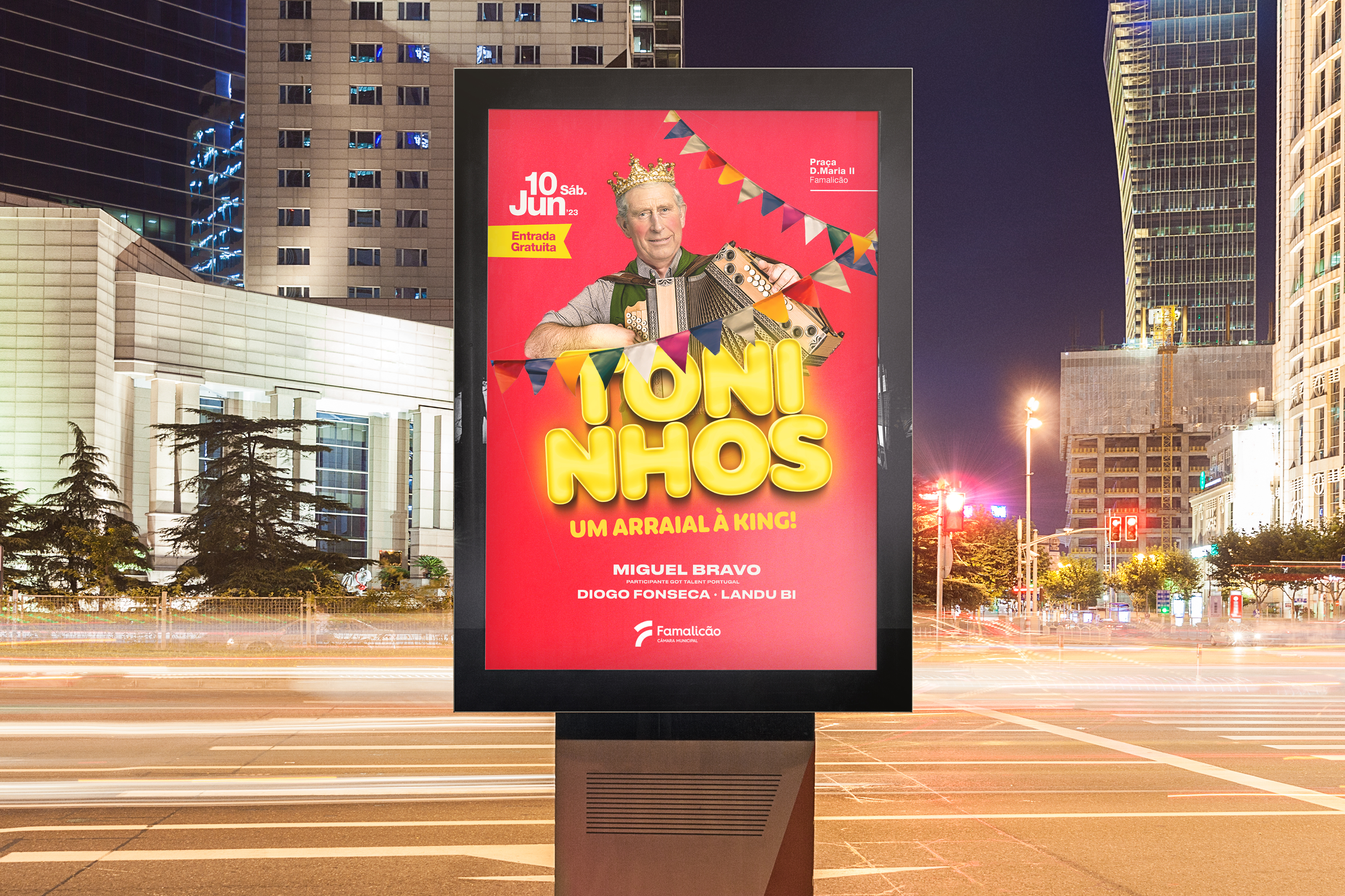 Para celebrar o arraial dos ''Toninhos'' evento realizado em Vila Nova de Famalicão, foi nos lançado um desafio de criação da imagem corporativa do evento para o ano de 2023. De modo a representar uma vertente divertida lançamos uma proposta que englobasse um tema atual (Eleição do Príncipe Carlos) com originalidade e criatividade. Proposto pela Câmera Municipal de Vila Nova de Famalicão, esta imagem teve como principal objetivo atrair um público jovem para o evento.