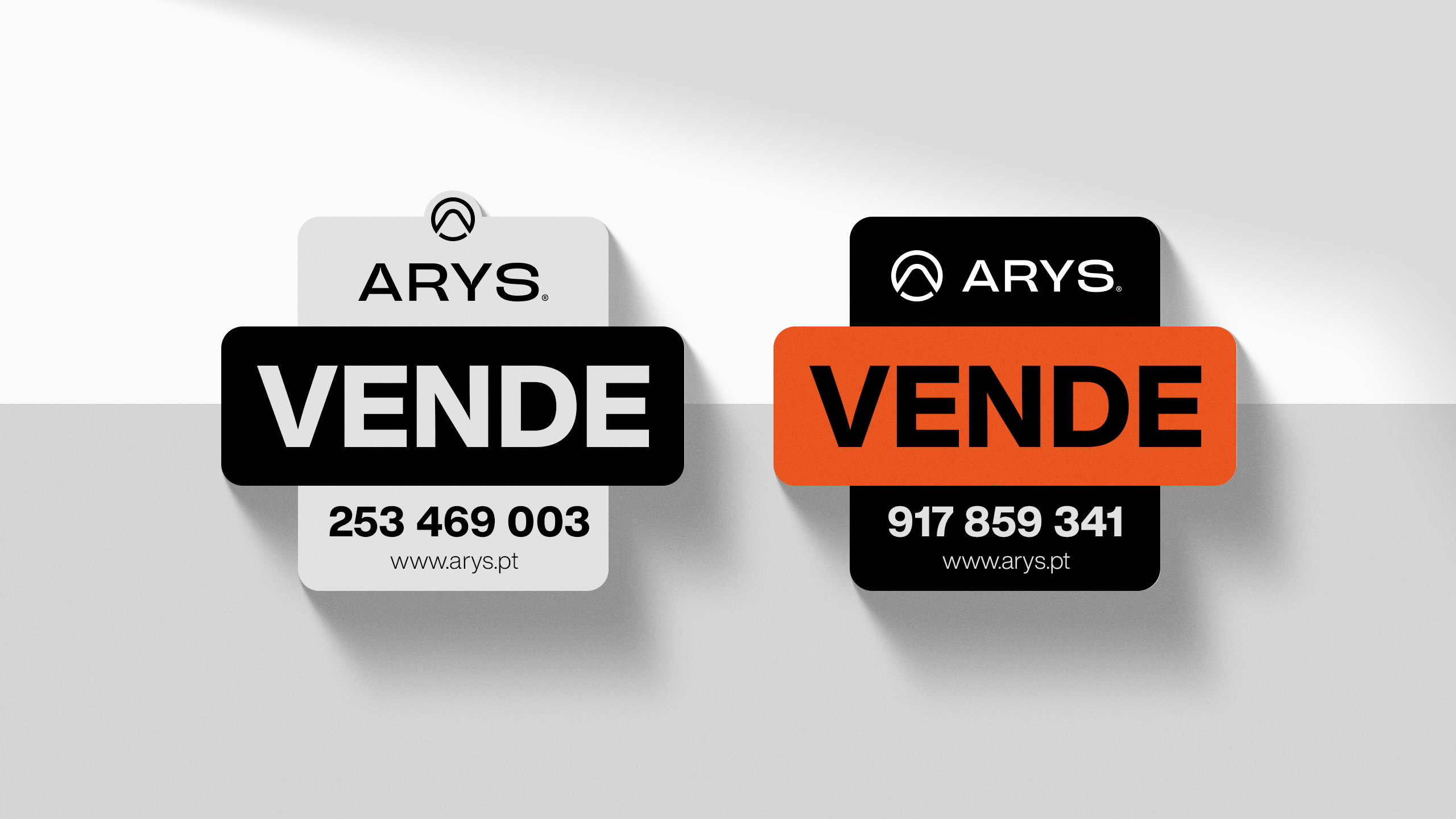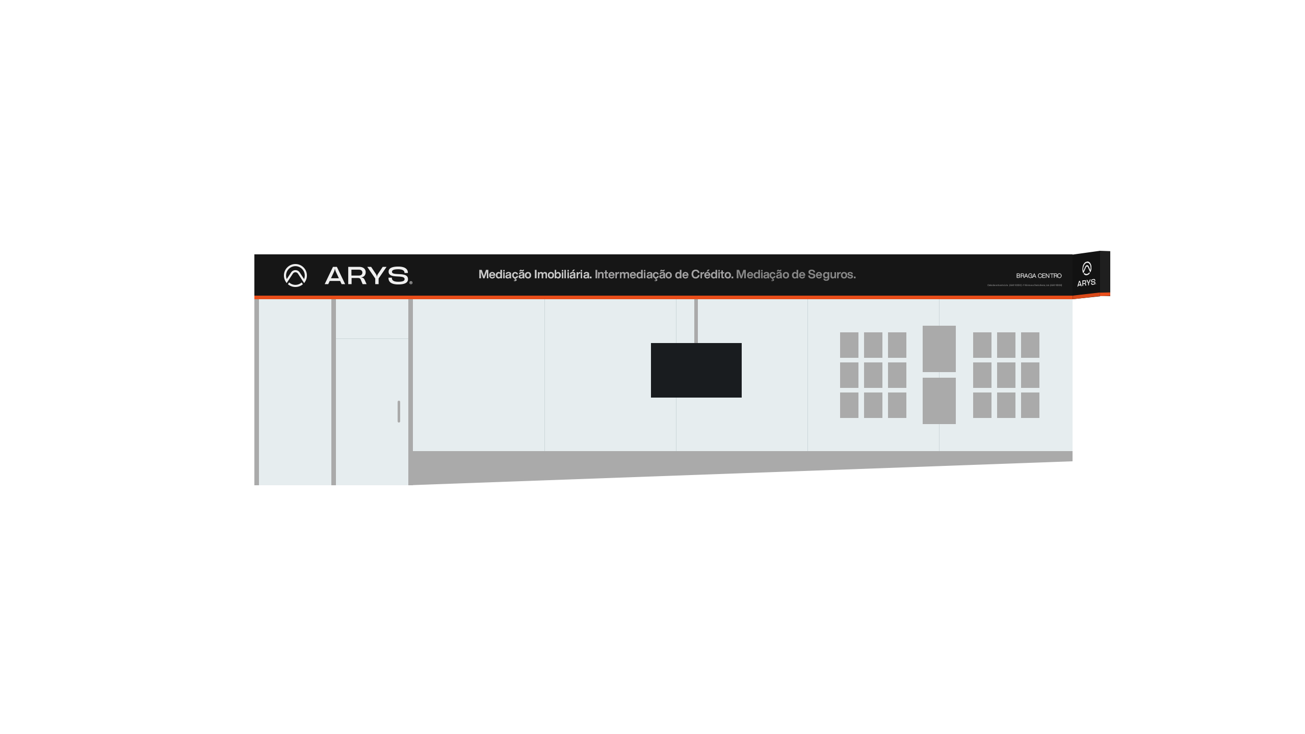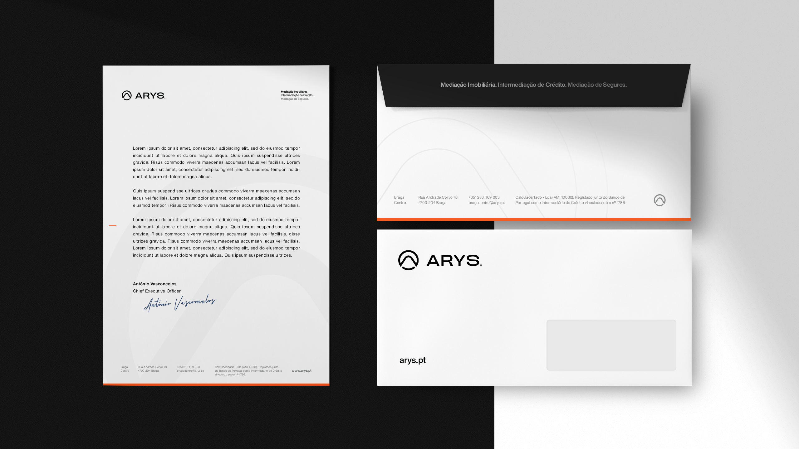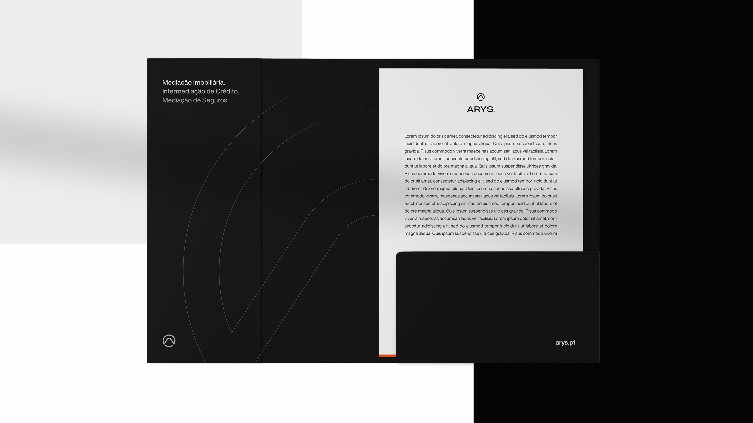 A criação da identidade visual da Arys assentou na construção de uma marca visualmente forte e com leitura imediata. O símbolo incorpora vários elementos-chave do posicionamento da marca: o círculo representa união e abrangência; o triângulo remete para crescimento e estabilidade; a letra “A” e o ícone de um telhado estabelecem uma ligação direta ao setor imobiliário. Esta composição simbólica transmite confiança, proximidade e inovação — pilares centrais da proposta de valor da Arys.A identidade foi pensada para ter alta adaptabilidade em todos os suportes e para criar reconhecimento imediato da marca. A paleta cromática, dominada por tons de cinza com toques estratégicos de laranja fogo, reforça o contraste entre sofisticação e energia, ajudando a Arys a destacar-se num mercado onde a diferenciação é chave.