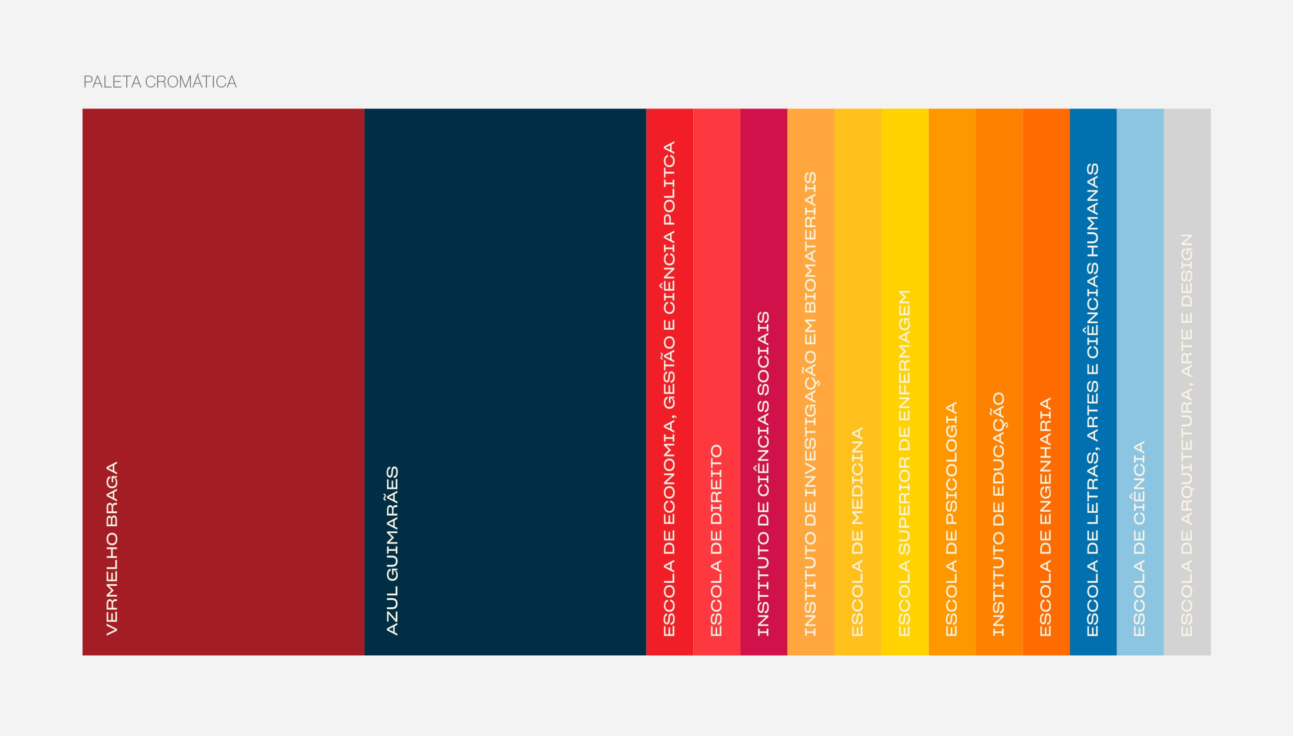 A linguagem visual partiu da paleta cromática completa das escolas para espelhar a diversidade académica, fundindo o vermelho de Braga e o azul de Guimarães num sistema que celebra a identidade bi-campus e o sentimento de pertença.