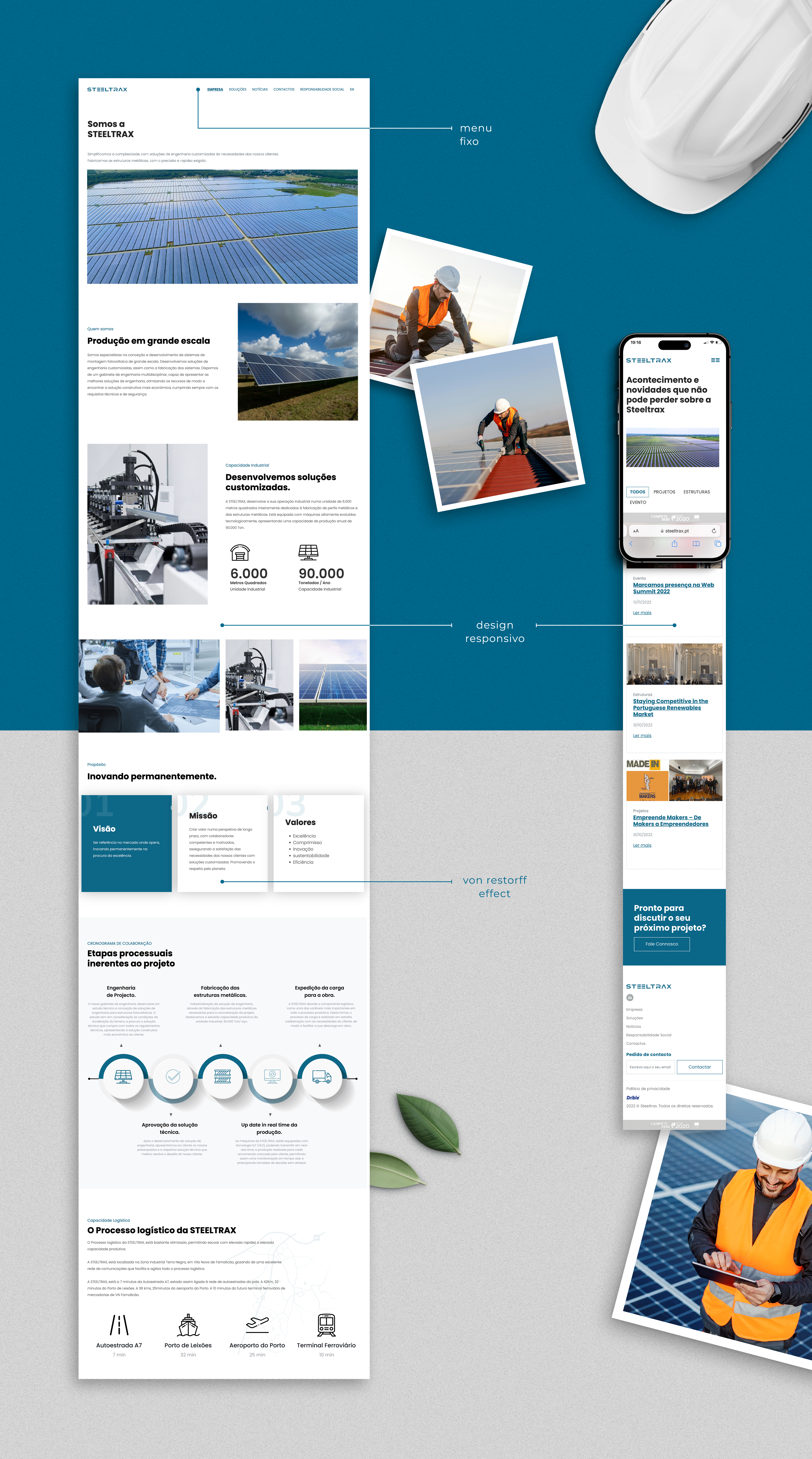 Focados no desenvolvimento de um website que transmitisse, de forma apelativa e dinâmica, a área de atuação da STEELTRAX e os valores que esta empresa prioriza na sua atividade, criámos um projeto com uma forte componente visual.